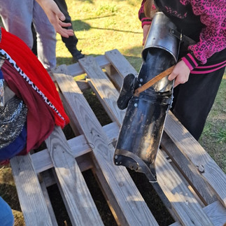 Zanim jednak zasłużyliśmy na audiencję, czekała na nas prawdziwa uczta dla oka i ducha. Dzięki uprzejmości taty i wujka Nadii z klasy 5, mogliśmy z bliska zobaczyć repliki zbroi rycerskiej, miecza i tarczy, które wywołały westchnienia zachwytu, szeptane „wooow” i pytania: „czy można dotknąć?”.