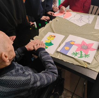 Wspólnie z mieszkańcami tworzyliśmy kolorowe puzzle z papieru, które po złożeniu zamieniły się w piękne, wiosenne kompozycje. Nie zabrakło też wielkanocnych akcentów – pisanki powstałe przy pomocy gąbek i farb zachwyciły nie tylko kolorami, ale i kreatywnością twórców, tych młodszych i starszych.